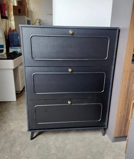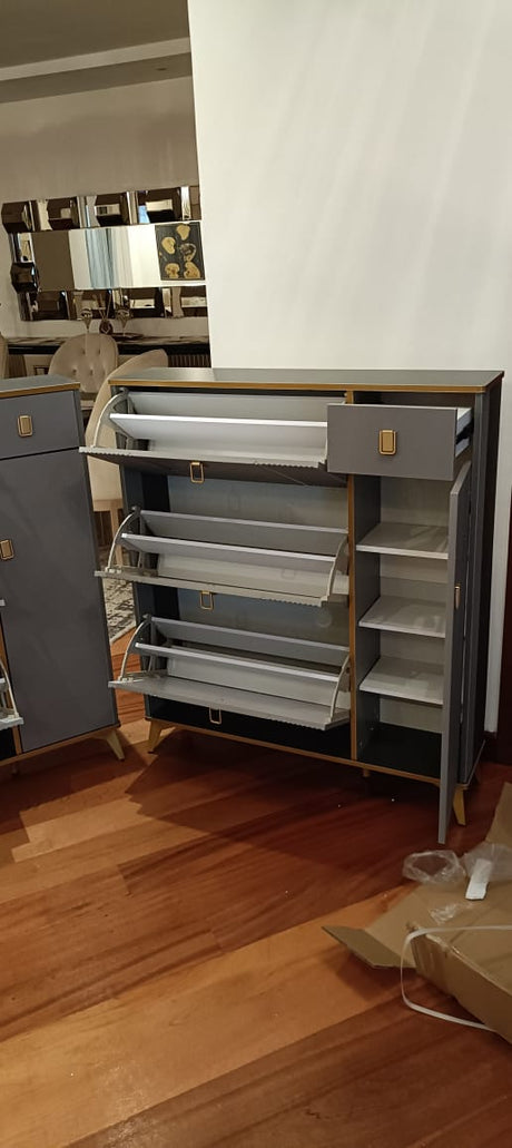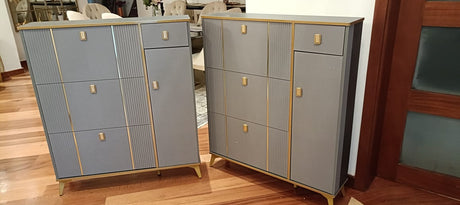 Entryway Shoe Cabinet Organizer Grey Triple-Layer Flip Rack with Golden Details