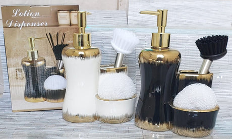 Combined 3 level ceramic lotion / soap dispenser with 2 slots brush and wash pad