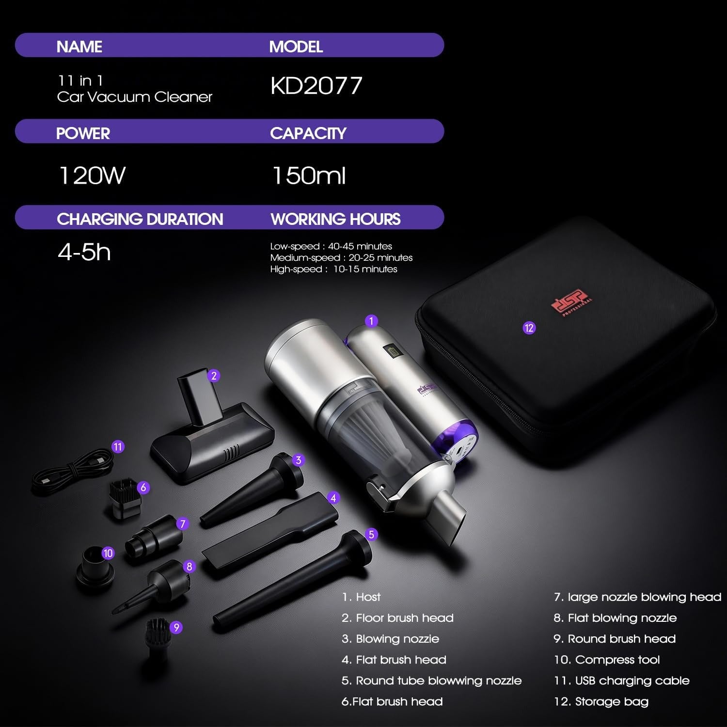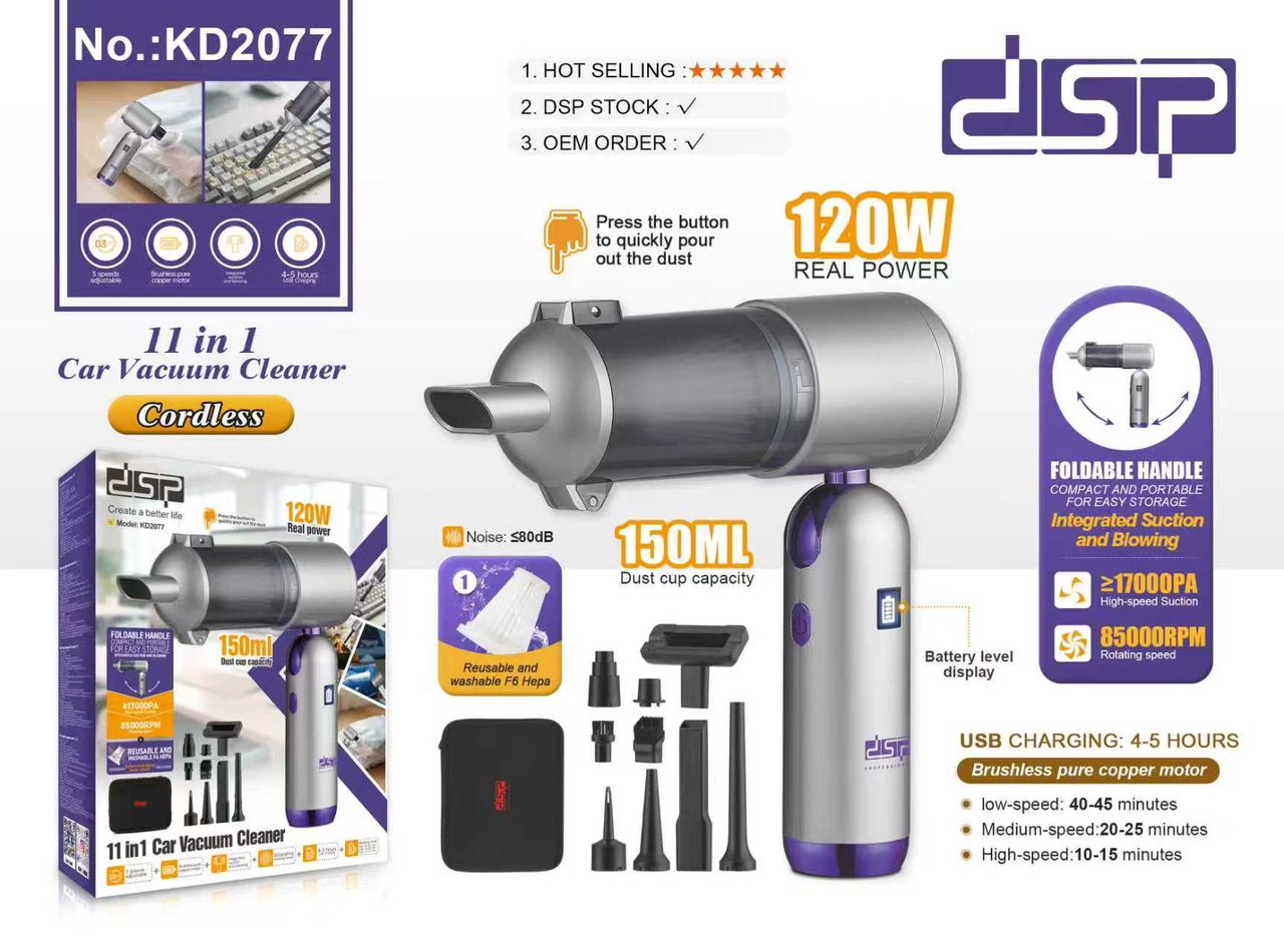 Keep your car and home spotless with the DSP 11-in-1 Handheld Car Vacuum Cleaner, a powerful and versatile cleaning solution designed for everyday messes. Powered by a 120W high-performance motor and delivering up to 17kPa strong suction, this cordless vacuum easily removes dust, crumbs, pet hair, and debris from tight and hard-to-reach areas.
