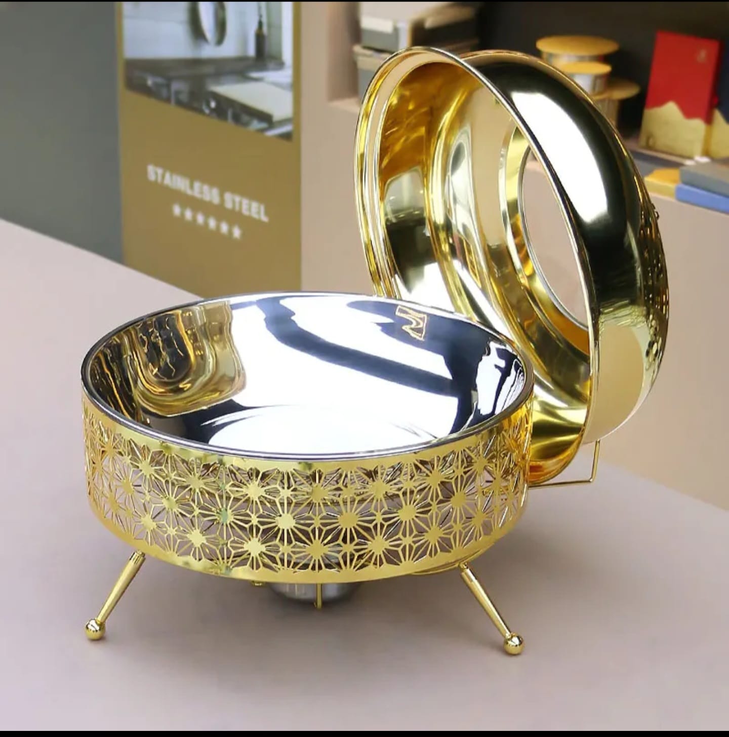 This luxury chaffing dish food warmer features a transparent glass lid cover for easy viewing and a heating stove at the bottom that maintains the ideal serving temperature. Built using durable, high-quality stainless steel, it delivers both long-lasting performance and a premium dining presentation.