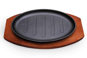 Crafted with durable cast iron, this hot sizzling plate comes complete with a sturdy wooden tray for convenient handling. Perfect for serving and sharing sizzling dishes, its versatile oval and round shape adds an elegant touch to your table setting. Experience delicious meals with this essential cookware.