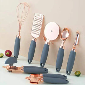 Indulge in ultimate culinary convenience with our top-notch heavy duty 7-piece kitchen gadget set! This set boasts a whisk, grater, pizza cutter, garlic press, can opener, ice-cream scoop, and peeler, all made with premium quality materials. The handle features a sleek silicone design for added comfort and durability.