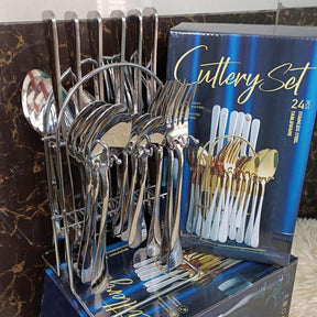 This 24 piece silverware set comes with 6 each of Dinner Spoons, Dinner Forks, Dinner Knives, and Teaspoons, a Cutlery package Cutlery rack, Packaged in a beautiful gift box. Great for Mother’s Day, Housewarming, everyday use, entertaining, weddings, and other special occasions. Made of high-quality stainless steel for your health, this set is strong enough for everyday use and resistant to rust. With an elegant and sleek appearance, these silverware sets are polished to a mirror-like shine. The utensils have a good weight and are well-designed for adults and children to comfortably hold. This modern and upscale cutlery set also includes a storage rack for easy organization and can be displayed as a home decoration. Packed in a lovely gift box, this forks and spoons silverware set is perfect for gifting to friends and family for holidays and events like Housewarming, Thanks Giving, Wedding, Christmas, etc.