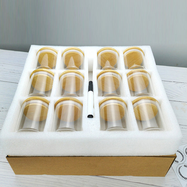 Efficiently store and organize your pantry with our Round Glass Jars Set. Made with eco-friendly Bamboo lids, each 300ml jar comes with a label and pen for easy identification. This set of 12 jars is perfect for keeping your kitchen essentials fresh and easily accessible.