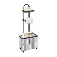 - Features: Toilet paper dispenser, reserve roll storage, top shelf for devices/magazines