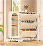 - SPACE SAVING SHOE CABINET The shoe cabinet has 3 folding drawers, 1 top shelf and a folding shoe stool for 18-24 pairs of shoes. It is a great storage solution to eliminate messy stacks of shoes in closets and entryways.