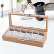 Unleash your inner organizational skills with our 6 slots wooden watch organizer! This watch display case, adorned with a sleek glass top, doubles as a jewelry organizer for both men and women. The durable wooden material ensures long-lasting use and measures 31*12*7.5cm in size.