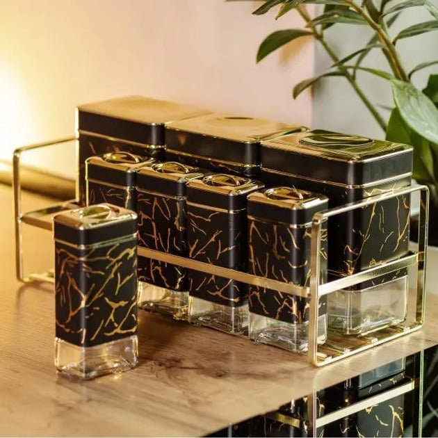 8-Piece Spice & Seasoning Storage Jars Set with Stand Coffee, Tea, Sugar & Condiment Containers Set - Black is backordered and will ship as soon as it is back in stock.