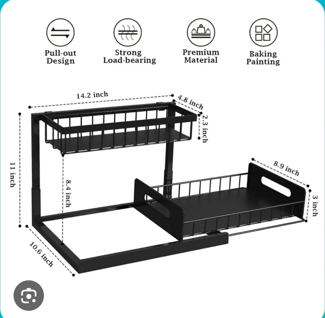 Introducing our 2 tier metallic sliding pull out cabinet organizer rack. With this innovative design, you can easily access your kitchen essentials in a clutter-free manner. The sturdy construction and sliding mechanism make organizing a breeze. Say goodbye to rummaging through cabinets and hello to efficiency and organization.