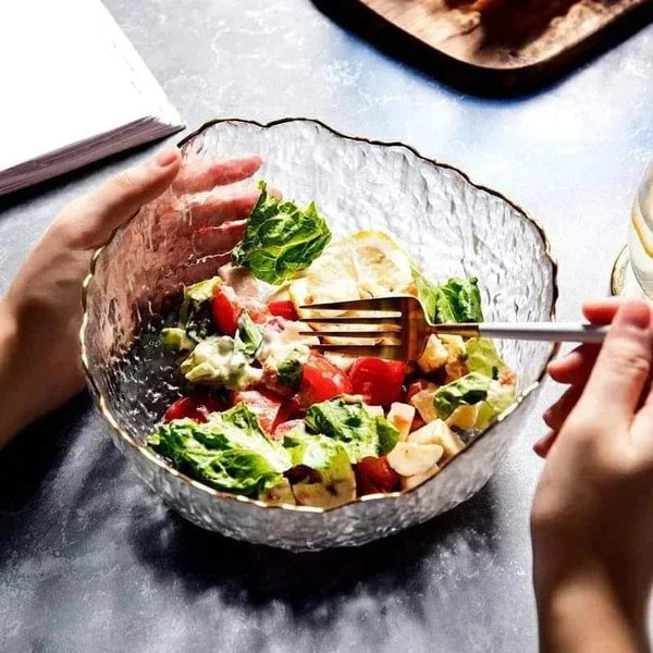 Elevate your dining experience with these 2 elegant Japanese glass bowls featuring a unique irregular shape and luxurious gold rim. Perfect for serving salads, fruits, snacks, and more. Made of high-quality glass and available in sizes 1050ml and 750ml. Add a touch of elegance to your table with these versatile bowls.