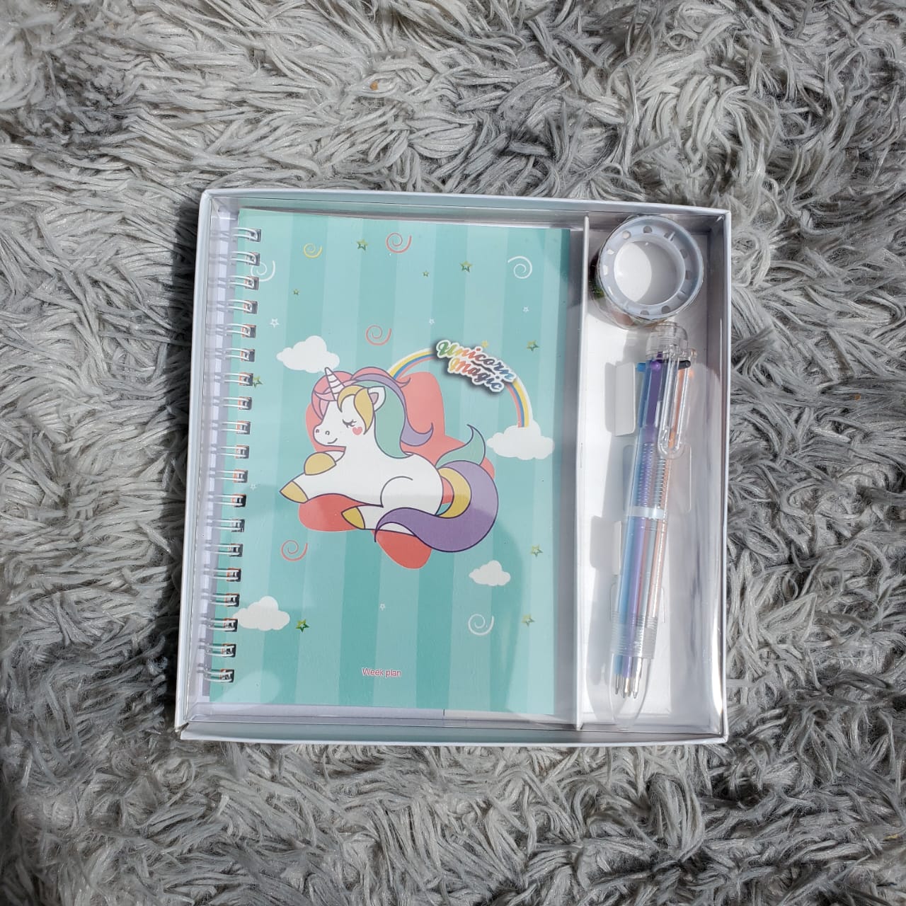 This 3 in 1 Unicorn Notebook comes with a notebook, pen, and tape, all packaged in a box. With this convenient and adorable set, you can easily jot down notes, make corrections, and organize your thoughts on the go. Perfect for any unicorn lover or stationary enthusiast.
