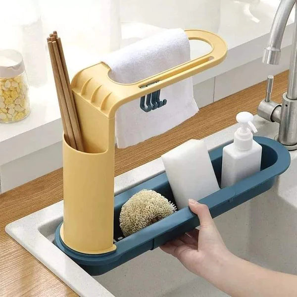 Organize your sink space with this easy-to-use Expandable Sink Organizer. It expands to fit your sink and compresses for simple storage. With three compartments to store all your kitchen items, you can keep your counter top clutter-free. Make the most of your sink space!