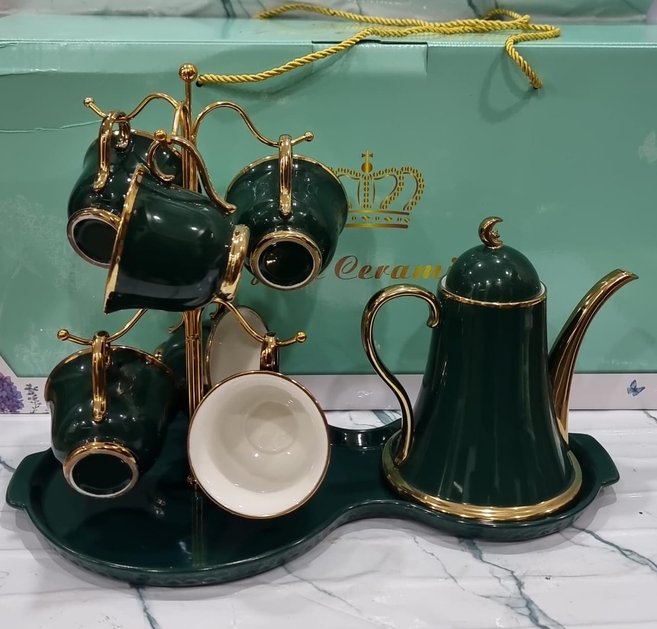 This fine ceramic 9pc tea set is a must-have for any tea lover. With a cup stand, 6 cups, kettle, and 8-shaped tray, this set is both functional and elegant. Crafted from high-quality materials, it is sure to enhance your tea-drinking experience. Perfect for entertaining or everyday use.