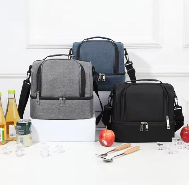 This insulated lunch bag keeps your food fresh and at the ideal temperature for up to 6 hours. Designed with high-quality insulation, it provides superior heat and cold retention. Available in black, grey, and blue. Perfect for on-the-go meals and picnics.