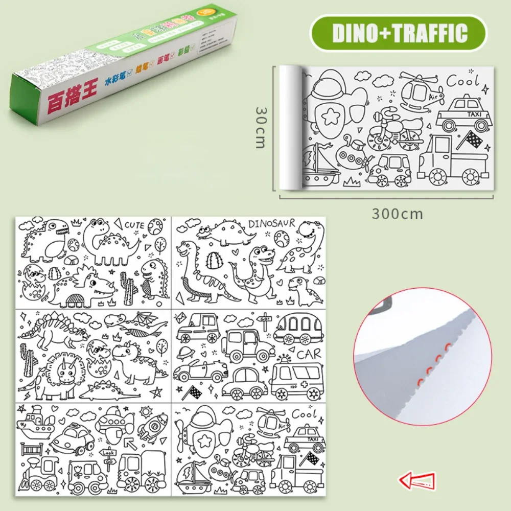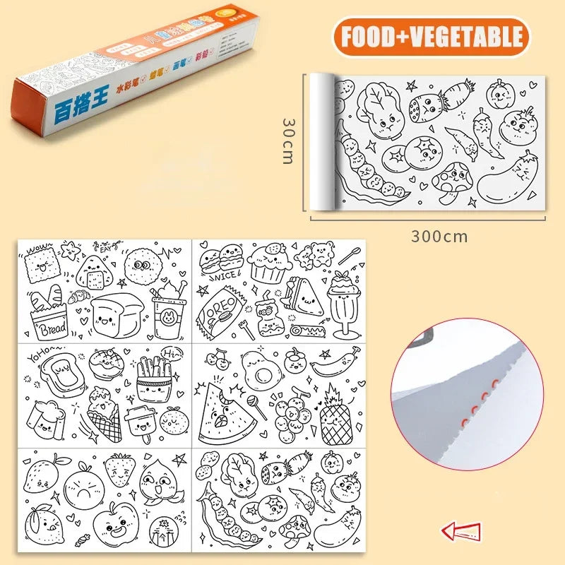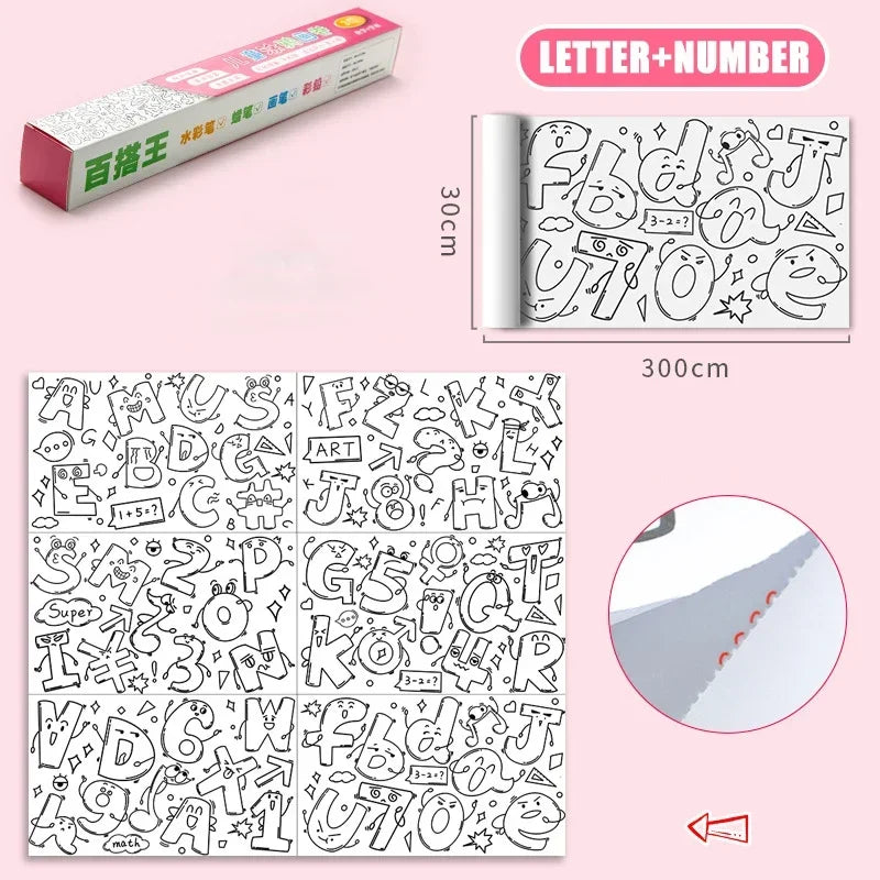 1. Easy to Cut: Easy to tear tooth line design, easy to segment graffiti, more convenient to use. The 300cm/120inch pattern is not repeated, the content is rich, and the baby loves to explore. Tooth line design, easy segmented graffiti, 50 cm section.